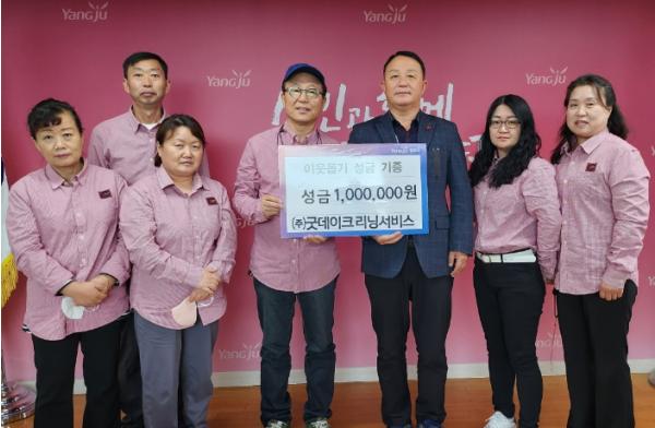 (주)굿데이크리닝서비스는 지난 3일 양주1동 행정복지센터를 방문해 ‘온품캠페인’에 써달라며 성금 100만원을 기부했다.