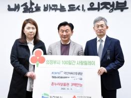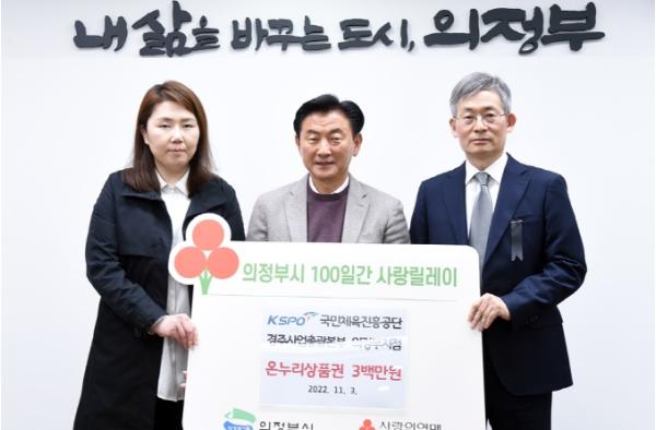 의정부시는 11월 3일 국민체육진흥공단 경주사업총괄본부 의정부지점이 의정부시청을 방문해 ‘100일간 사랑릴레이 배턴 잇기’의 일환으로 온누리 상품권 300만 원을 기부했다고 밝혔다.