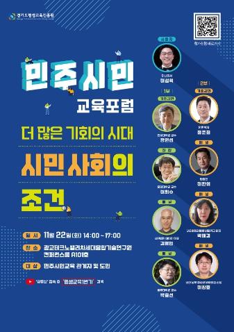 포럼은 ‘더 많은 기회의 시대 -시민사회의 조건’이라는 주제로 열리며, 미래를 위한 지속가능성에 관한 민주시민 교육 의식을 공유하기 위해 마련됐다. 관심 있는 경기도민과 민주시민교육 관계자라면 누구나 참여할 수 있다.
