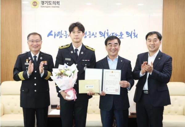 염 의장은 지난 14일 의장 접견실에서 윤종영 도의원(국민의힘, 연천), 이선영 연천소방서장이 배석한 가운데 연천 전곡119안전센터 소속 김신영 소방사(25)에 화재진압 유공자 표창을 수여했다.