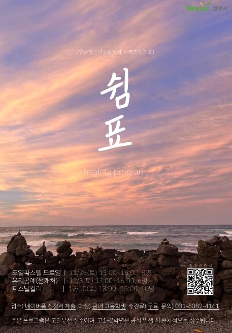 양주청소년문화의집은 학업 스트레스로 지친 지역 고등학생의 심신 치유와 건강한 일상회복을 위한 기획프로그램 ‘쉼표’에 참가할 학생을 오는 24일까지 모집한다.