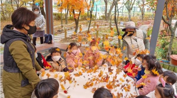 가을에는 열매와 씨앗의 이동 방법을 알아보고, 가을 열매로 밥상 차려보고, 주변에서 쉽게 볼 수 있는 흙을 모아 색깔별로 구분하고 흙 물감을 만들어 손가락 그림을 그려보며 오감을 이용하여 자연을 느끼는 시간을 경험했다.