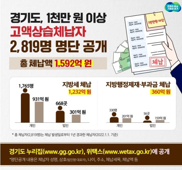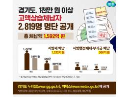 경기도가 1년이 지나도록 1천만 원 이상의 세금을 내지 않은 지방세, 지방행정제재·부과금 고액·상습 체납자 2천819명의 명단을 16일 경기도 누리집, 위택스. 지방세 납부 사이트)에 공개했다.