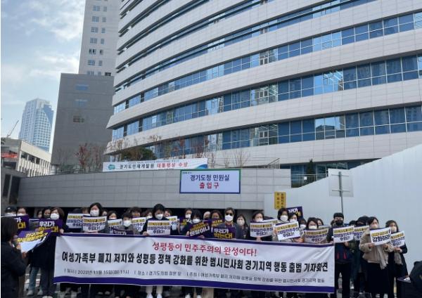 경기도의회 유호준 의원(더민주, 남양주6)이 지난 15일 11시 경기도청 입구에서 진행된 ‘여성가족부 폐지 저지와 국가 성평등 정책 강화’를 촉구하는 범시민사회 경기지역행동 출범 기자회견에 참석해 연대의 뜻을 밝혔다. 이번 경기지역행동 출범은 중앙정부의 여성가족부 폐지 움직임뿐만 아니라 경기도를 포함한 일부 지자체에서 ‘여성’, ‘성평등’을 부서명에서 삭제하는 안을 내거나 부서 폐지 예고, 관련 조례를 폐지 또는 개정을 추진하는 것을 저지하기 위한 움직임이기도 하다.
