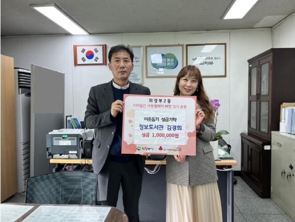 의정부시 의정부2동주민센터는 11월 15일 정보도서관에 근무하는 김경희 주무관이 ‘100일간 사랑릴레이 배턴잇기’에 동참하고자 성금 100만 원을 기탁했다고 밝혔다.
