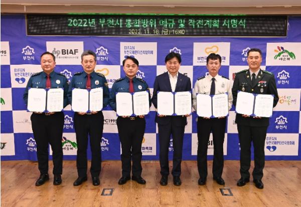 이날 서명식은 부천시장(부천시 통합방위협의회 의장), 부천원미경찰서장, 부천소사경찰서장, 부천오정경찰서장, 부천소방서장, 제7873부대 48대대장이 참석한 가운데 각 기관이 부천시 통합방위태세 확립에 대한 공감대를 형성하는 뜻깊은 시간이 됐다.
