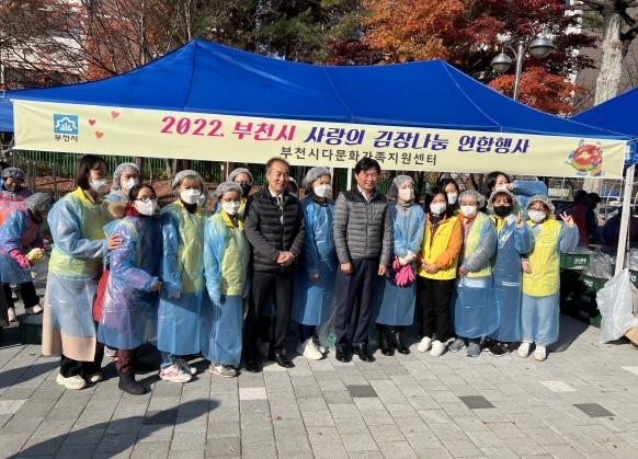 부천시다문화가족지원센터는 지난 11월 부천시자원봉사센터 주관으로 신중동지역사회보장협의체를 비롯한 지역내 유관기관과 연합하여 금강어린이 공원에서 ‘2022년 사랑의 김장나눔 연합행사’를 개최했다.