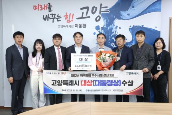 고양특례시가 행정안전부·인사혁신처·국무조정실이 공동 주관한 2022년 적극행정 우수사례 경진대회에서 영예의 대상인 대통령상을 수상해 특별교부세 5천만원을 확보했다. 이로써 시는 범정부 ‘적극행정 우수사례 경진대회’에서 3년 연속 수상하는 쾌거를 이뤘다.
