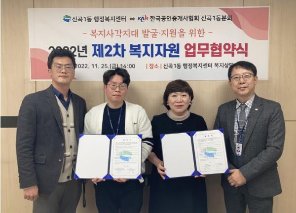 의정부시 신곡1동행정복지센터는 11월 25일 한국공인중개사협회 의정부시지회 신곡1동분회와 지역 내 복지사각지대 위기가구 발굴과 지원 협력을 위한 업무협약을 체결했다.