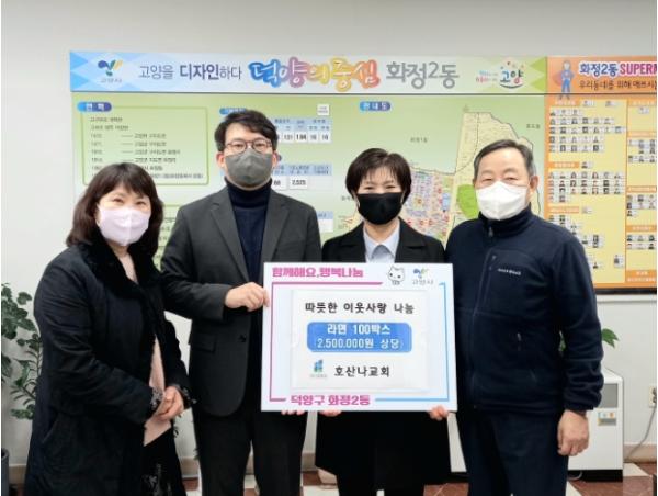 고양특례시 화정2동 행정복지센터는 지난 25일 호산나 교회 관계자가 참석한 가운데 250만 원 상당의 후원물품(라면) 전달식을 진행했다.