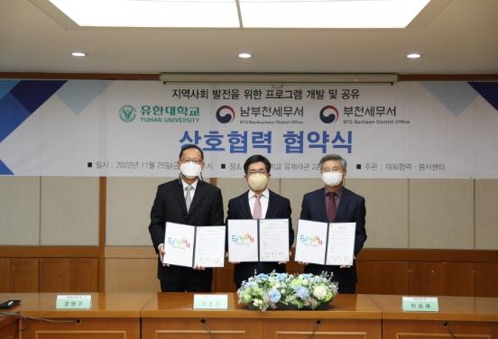 유한대학교는 남부천세무서, 부천세무서와 ‘지역사회 발전을 위한 프로그램 개발 및 공유 상호협력 협약’을 유재라관 2층 회의실에서 체결했다.