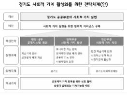 이에 함께 경기도 도정운영의 기본 가치로서 사회적 가치 중심의 패러다임 전환을 위한 중장기적 경기도 정부혁신 차원에서의 질적 전환 추진 전략으로 ▲중장기적 관점에서 행정 전반의 정부혁신 차원의 확장 ▲자치법규 등 제도적 기반 정비와 함께 실행체계 차원에서 전담부서의 위상을 재정립 등의 종합적 검토 ▲사회적 가치 중심의 전환과 지표개발 및 적용과정에서 사회적 공론화 ▲공공부문 및 민간부문을 연계와 사회적 가치 생태계 차원의 지원 등을 제시했다.
