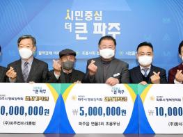 (재)파주시행복장학회는 19일 ㈜동마기업과 ㈜파주컨트리클럽에서 각 천만원, 조용무 어르신(▲파주읍연풍3리, 82세)으로부터 5백만원을 기탁받았다. 특히 조용무 어르신은 파주에서 농사지으며 오랫동안 아껴 모은 금액을 기부해 의의가 크다.