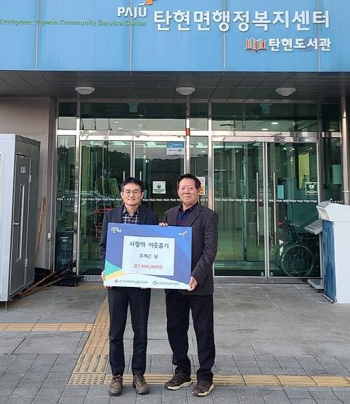 파주시 탄현면은 개인기부자 유재근 씨로부터 200만원 상당의 백미를 기탁 받았다.