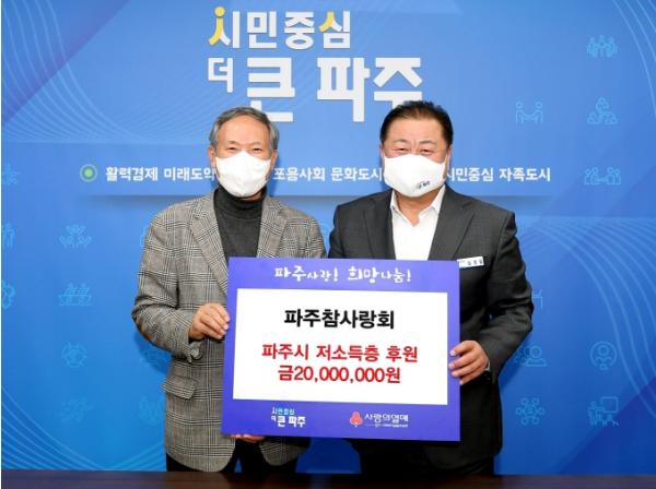파주시는 10일 파주참사랑회에서 파주시 소외계층을 위한 이웃돕기 성금 2천만원을 기탁받았다.