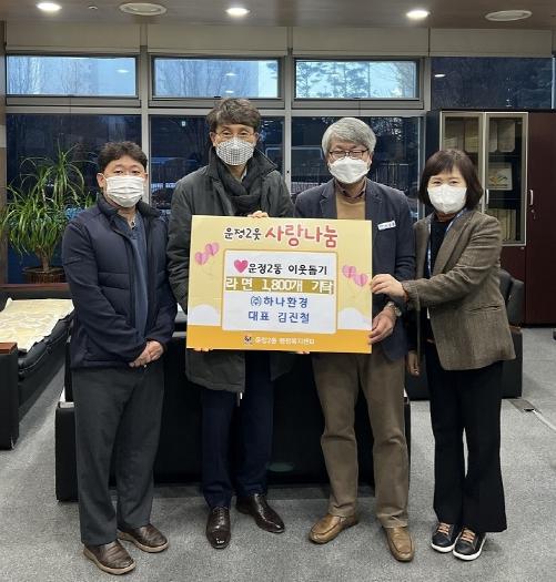 이날 ㈜하나환경은 운정행정복지센터에 방문해 어려운 이웃을 위해 써달라며 라면 1,800개를 기부했다.