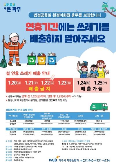 파주시는 환경미화원 휴무 보장을 위해 설 연휴 기간(1.21.~1.24.)에는 생활쓰레기를 수거하지 않는다고 밝혔다.