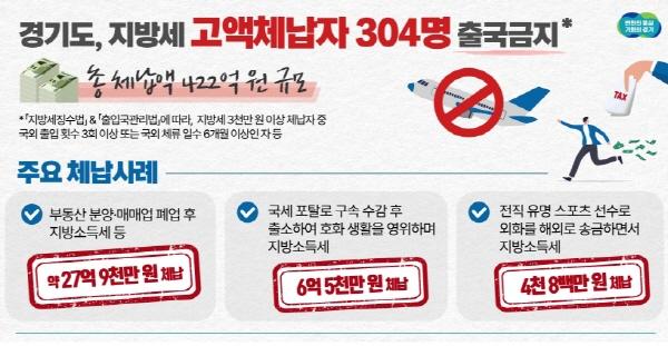 경기도가 지방세 3천만 원 이상 고액 체납자 가운데 해외로 재산을 은닉하거나 도피할 우려가 있는 고질·악성 체납자 304명에 대해 법무부에 출국금지를 요청했다고 16일 밝혔다. 이들의 체납액은 총 422억 원에 이르며 최대 6개월간 해외 출국이 금지된다.