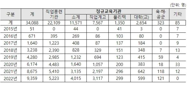 또한, 정규교육기관의 교육?훈련과정이 17.1% 증가하여, 직업교육-훈련?취업으로 이어지는 연결고리도 강화됐다.