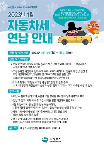 의정부시는 올해 부과될 자동차세를 1월에 미리 납부하면 연세액의 6.4%를 공제해주는 자동차세 연납 신청을 받는다고 밝혔다.