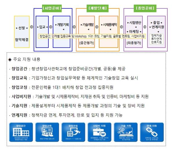 청년창업사관학교는 유망 창업상품(아이템)과 혁신기술을 보유한 우수 창업자를 발굴해 입주공간 제공, 교육·지도(코칭), 사업화자금 지원 등 창업 전 단계를 묶음(패키지)로 지원하는 사업이다.