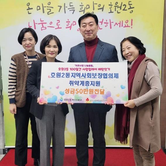 의정부시 호원2동 복지지원과는 1월 13일 동 지역사회보장협의체에서 계묘년 설 명절을 맞아 100일간 사랑릴레이 성금 50만 원을 기부했다고 밝혔다.