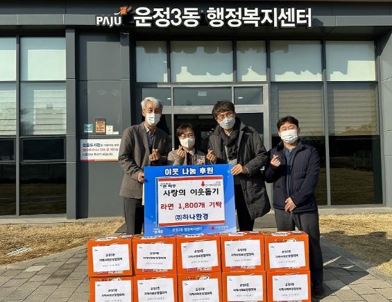 지난 12일에는 ㈜하나환경으로부터 라면 1,800개를 기탁 받았으며, 16일에는 파주시광고협회에서 성금 100만원을, 같은 날 운정합기도검무관에서는 성금 30만원을 기탁했다. 기부한 물품과 성금은 운정3동 취약계층 등에 전달될 예정이다.