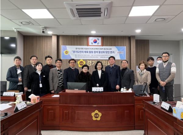 경기도의회 의원연구단체 '경기 체육 정책 연구포럼'은 지난 27일 의회 여성가족평생교육위원회 회의실에서 ‘경기도민의 체육 활동 참여 활성화 방안 연구를 위한 정책연구용역 중간보고회’를 개최했다.