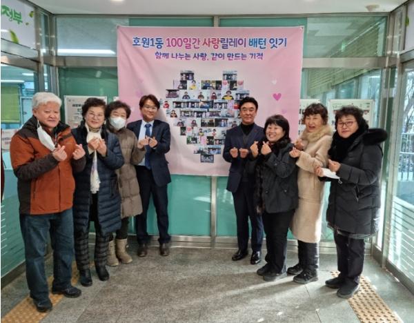 조복현 호원1동장은 “이번 100일간 사랑릴레이에 배턴잇기 운동에 참여해주신 한분 한분의 따뜻한 마음이 모여 기적을 만들었다. 모든 분들에게 진심으로 감사드리며, 앞으로도 나눔문화 조성에 앞장서 더불어 함께 살아가는 지역사회를 만들기 위해 노력하겠다”고 밝혔다.