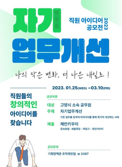 고양특례시는 민선8기 공약사항 및 시정 역점사업 성공적 추진 아이디어 발굴을 위해 고양시 직원을 대상으로 ‘자기업무개선 공모전’을 개최한다.